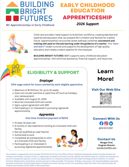 Building Bright Futures has created several fact sheets and flyers that you can download and use when talking to others about early childhood education apprenticeship and the BBF inititiave.